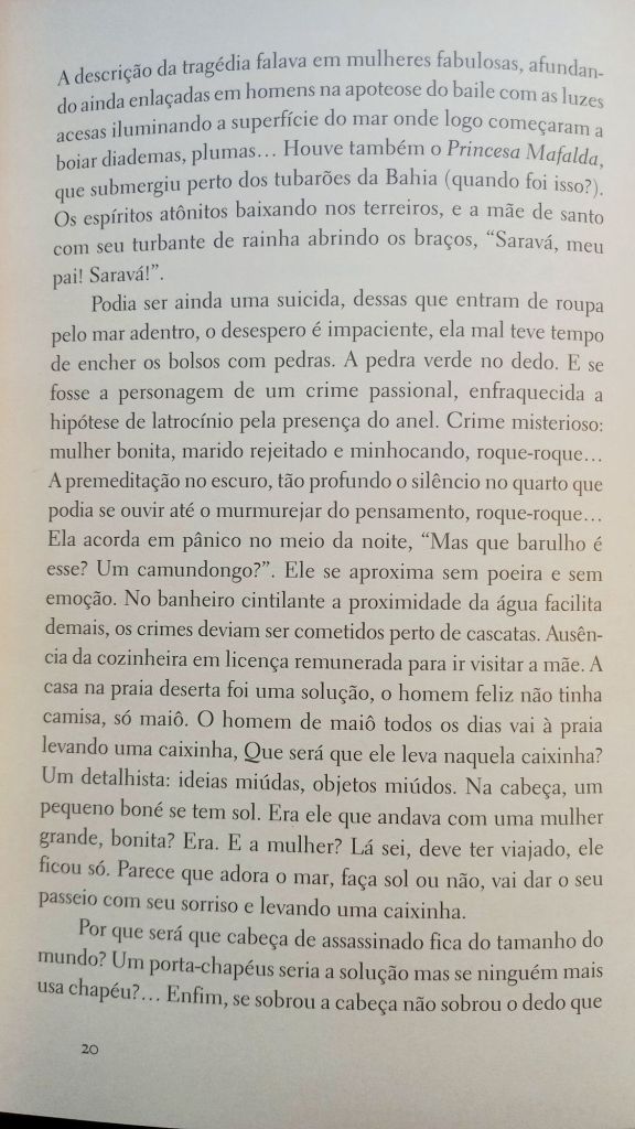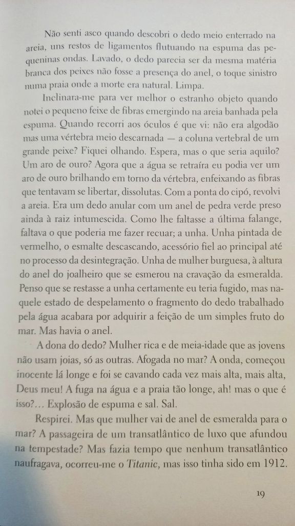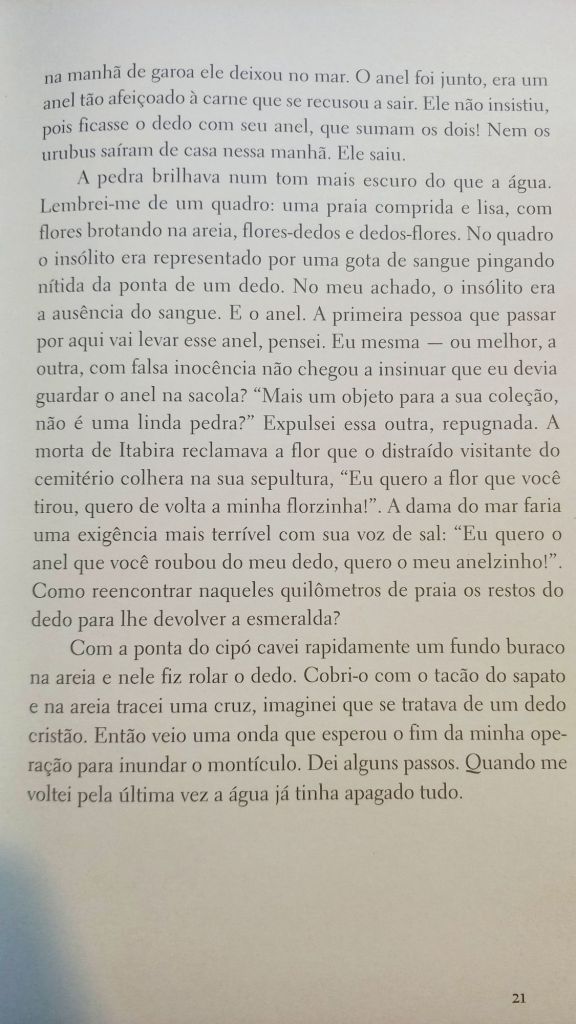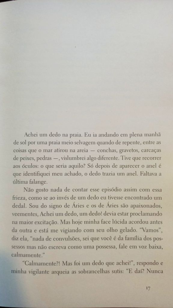 Note que a metonímia, a parte pelo todo, em Lygia se confunde com a metáfora, o símbolo. Porque o dedo encontrado de algum modo tece uma analogia com a solidão feminina – tanto da mulher dona do dedo quanto da narradora. A parte fala pelo todo, mas a parte também por si só significa algo além do que o todo.