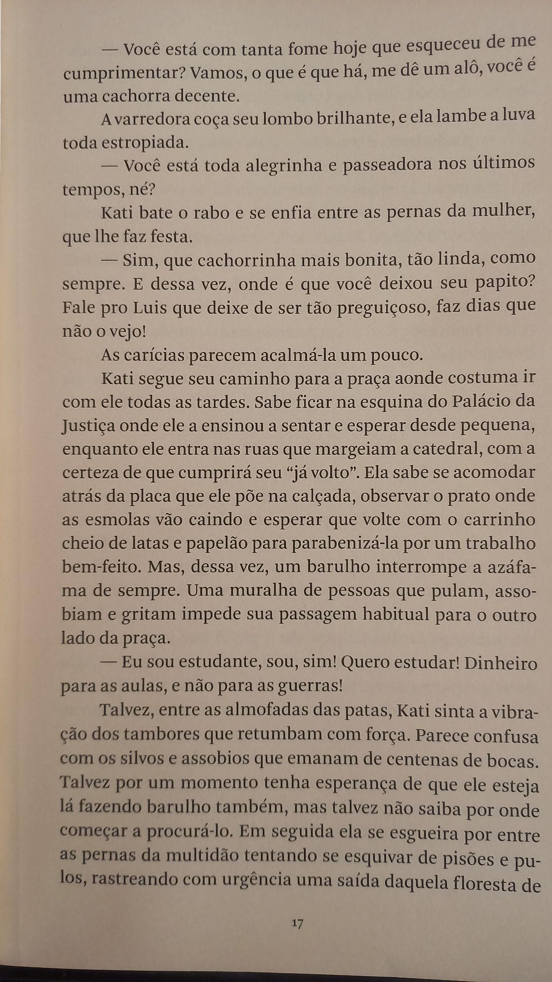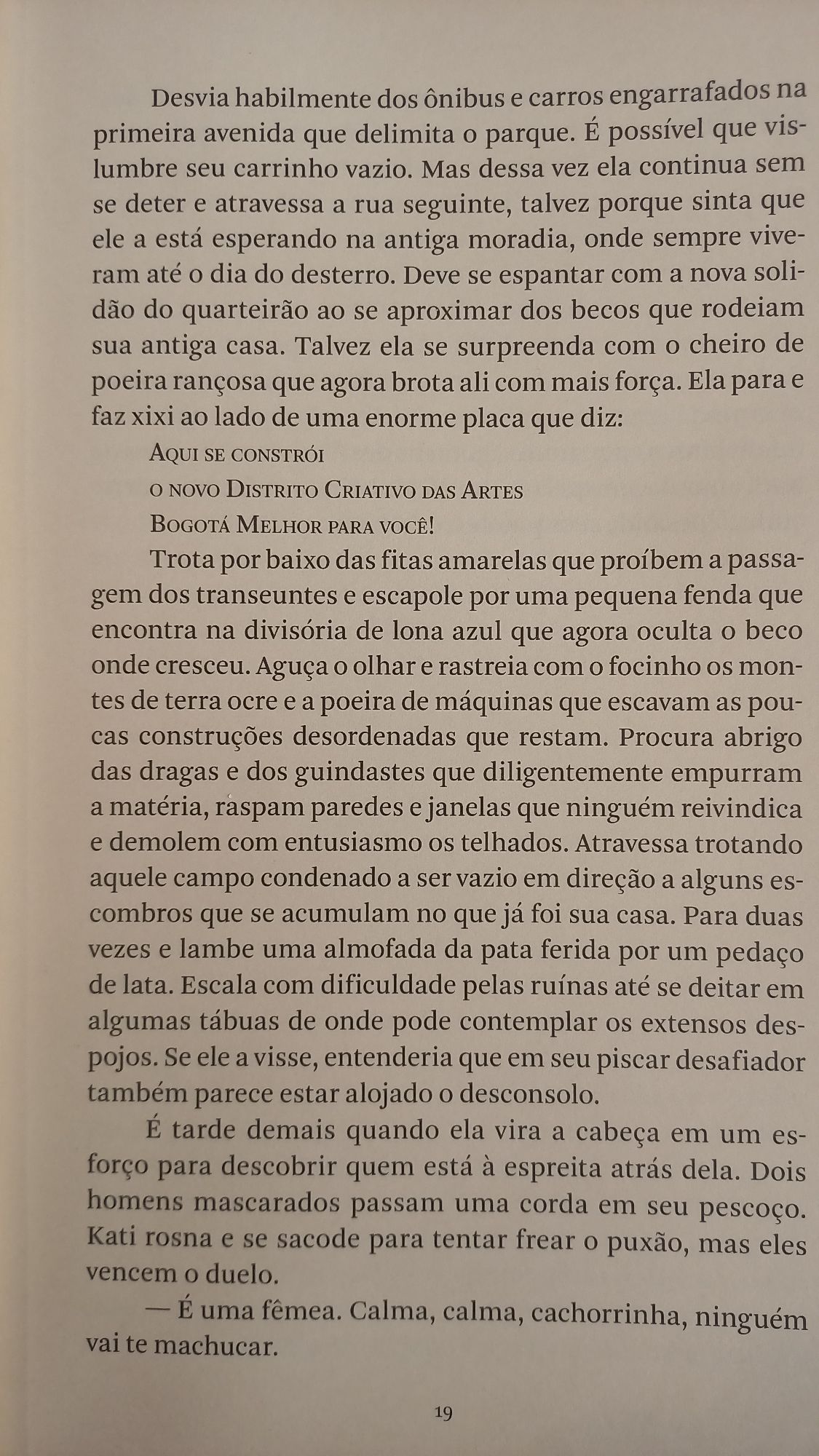 Não são tão distantes a cachorra Kati e Luís, seu primeiro tutor, um catador de lixo que sobrevive precariamente em Bogotá; do mesmo modo o pequeno besouro arrancado do conforto da terra e a mulher que intui que seus antepassados são os mesmos indígenas que, preferindo a morte à escravização imposta pelos colonizadores espanhóis, têm seus túmulos saqueados por modernos caçadores de tesouros; ou mesmo os pássaros em revoada se estilhaçando contra prédios espelhados e os manifestantes sob severo ataque da polícia.