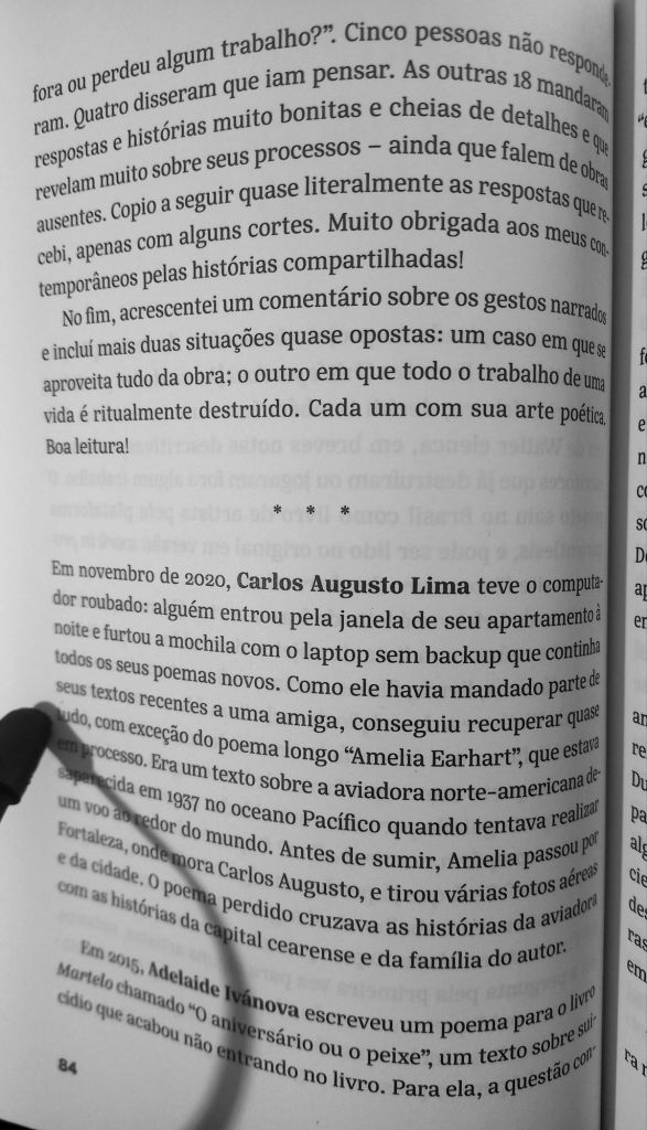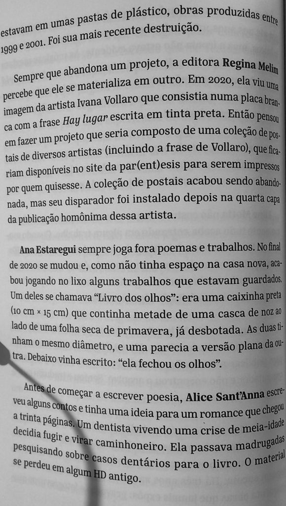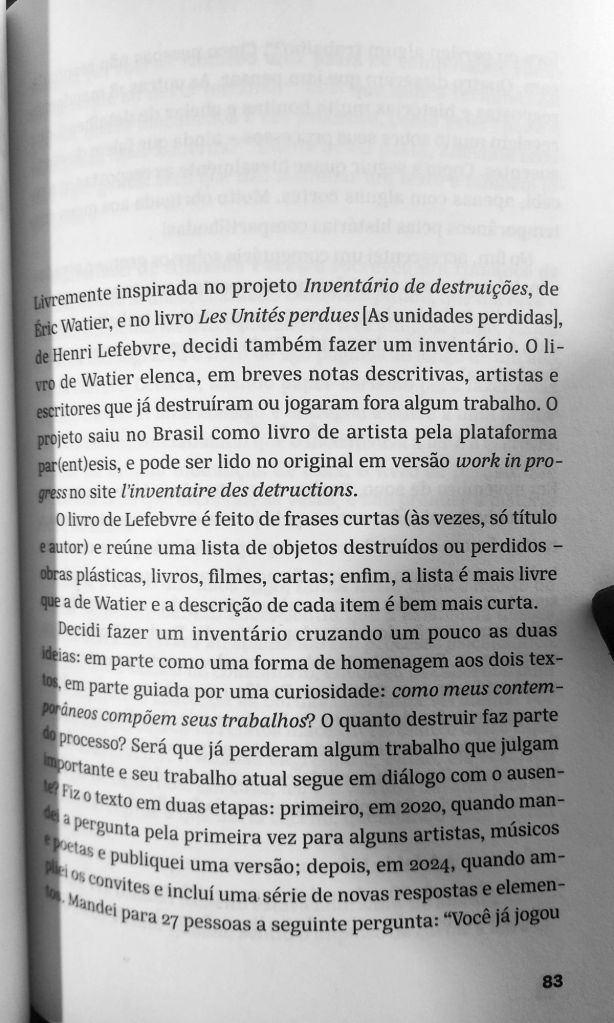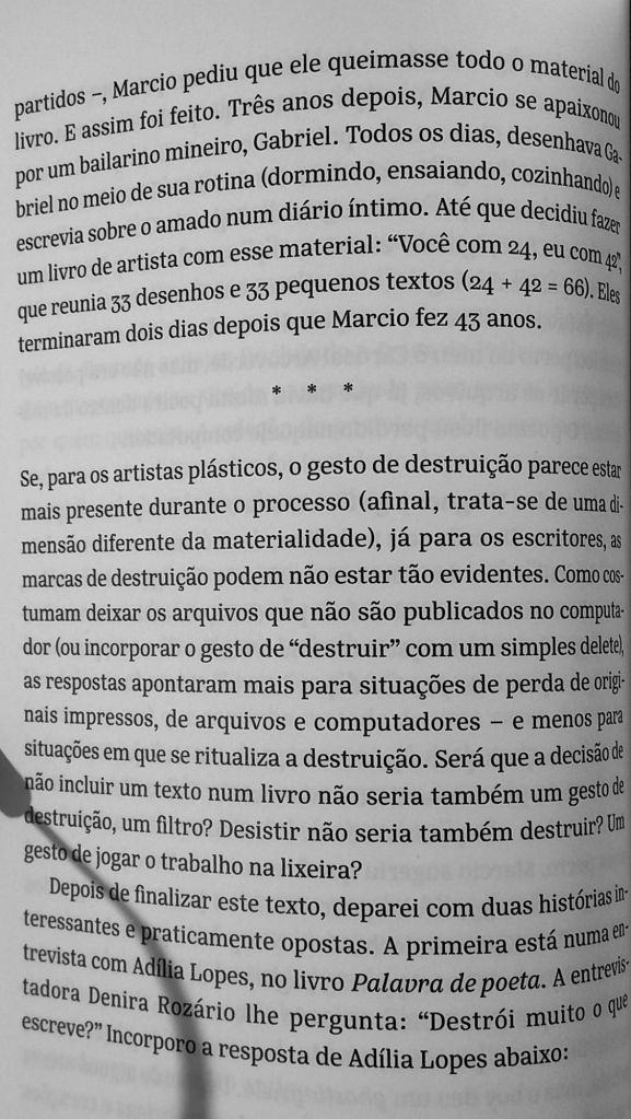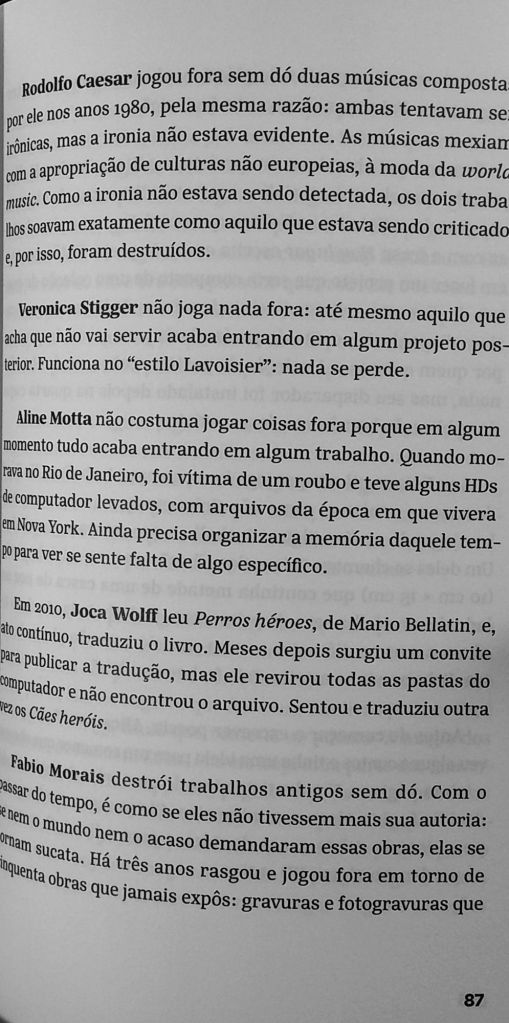 Assim como Garcia extrai elementos do ensaio para a poesia, também puxa elementos da poesia para o ensaio. No caso abaixo, ela elege um tema – a destruição do próprio trabalho – e o compõe como um coral de vozes. Alia o trabalho de reportagem – perguntar a poetas e artistas contemporâneos “você já perdeu ou jogou fora algum trabalho?” – ao da edição de cada depoimento, em que uma voz acaba por dar um significado diferente para outra, à medida em que se justapõem. O resultado é uma meditação lírica sobre como a destruição influi sobre a criação.
