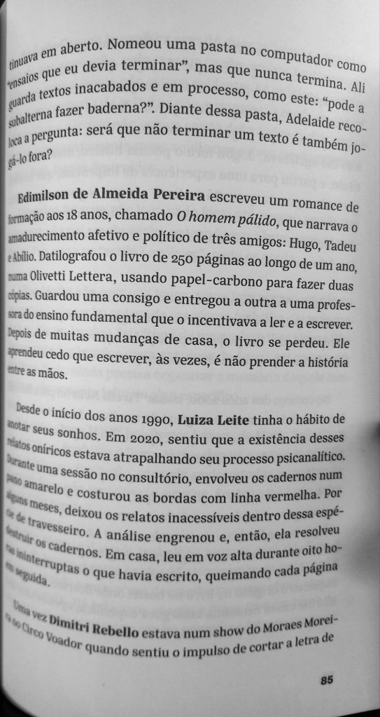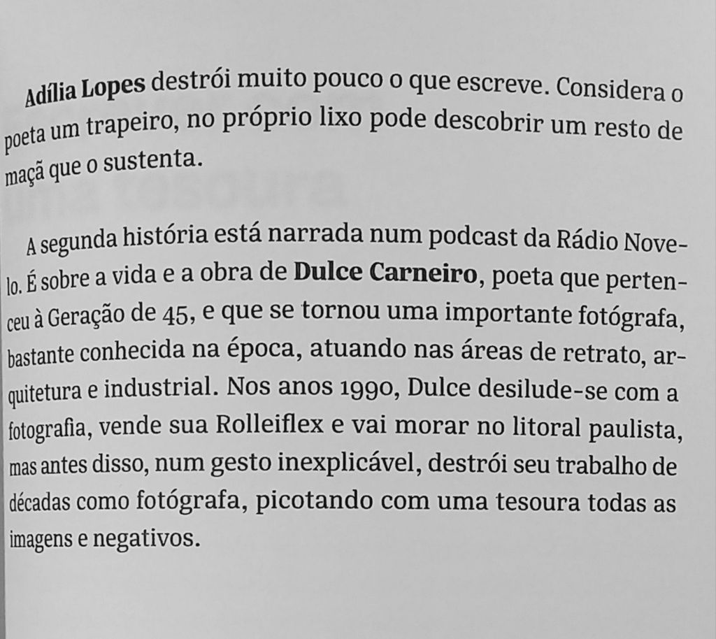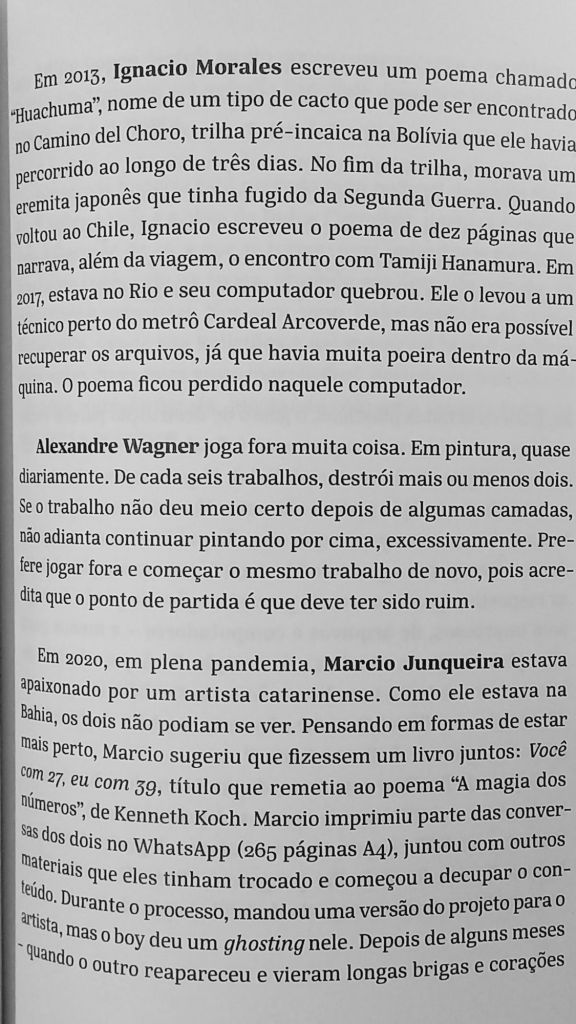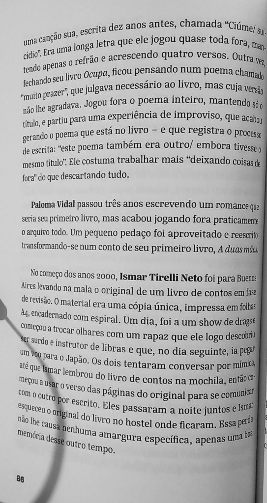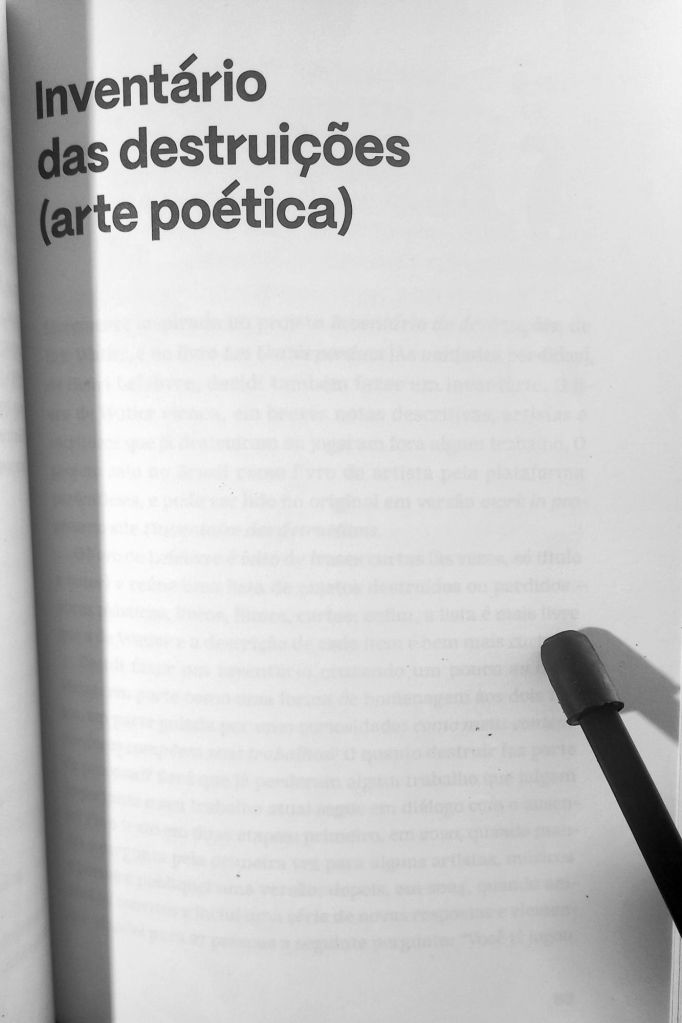 Assim como Garcia extrai elementos do ensaio para a poesia, também puxa elementos da poesia para o ensaio. No caso abaixo, ela elege um tema – a destruição do próprio trabalho – e o compõe como um coral de vozes. Alia o trabalho de reportagem – perguntar a poetas e artistas contemporâneos “você já perdeu ou jogou fora algum trabalho?” – ao da edição de cada depoimento, em que uma voz acaba por dar um significado diferente para outra, à medida em que se justapõem. O resultado é uma meditação lírica sobre como a destruição influi sobre a criação.