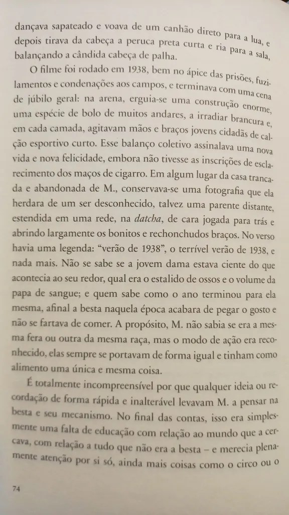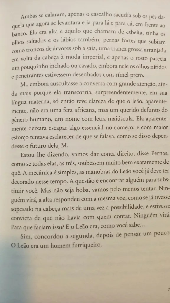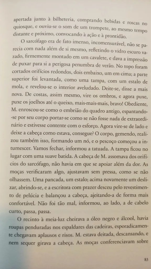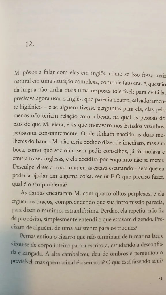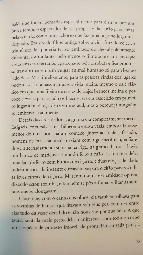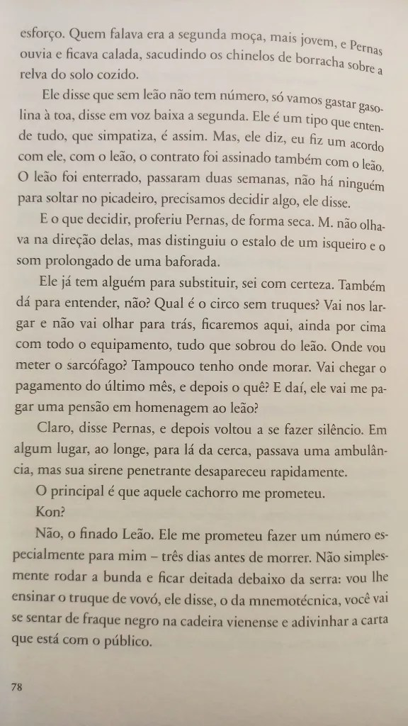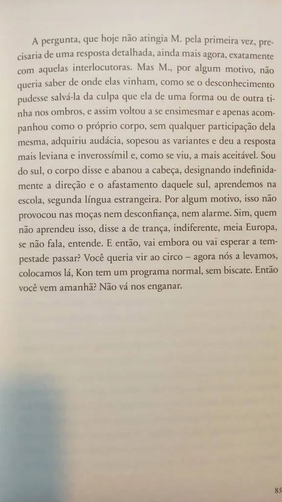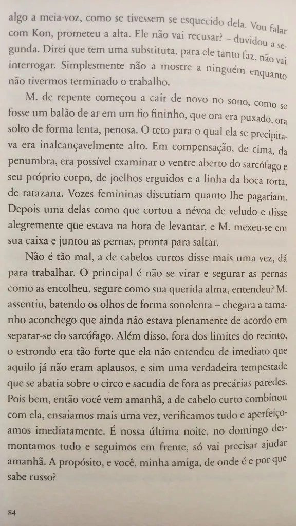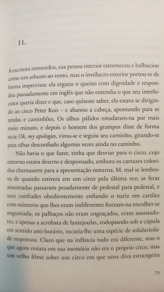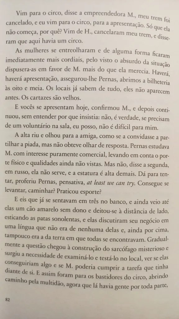 Neste pequeno romance, seguimos M., uma escritora cinquentona que parte para um evento literário em um país estrangeiro e que, depois de uma série de trapalhadas e burocracias, acaba tendo a chance de trabalhar como figurante em uma trupe de circo, sumindo como em um passe de mágica.