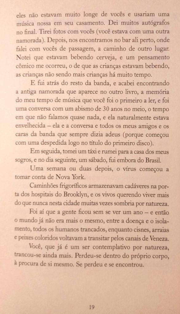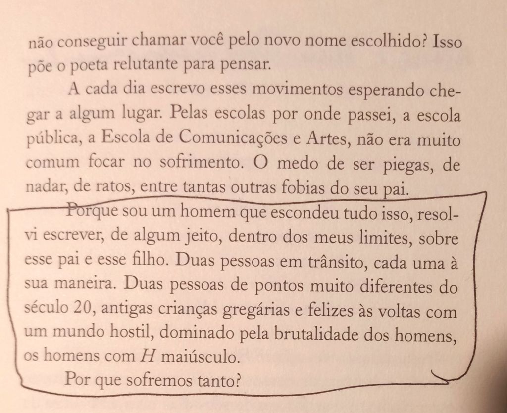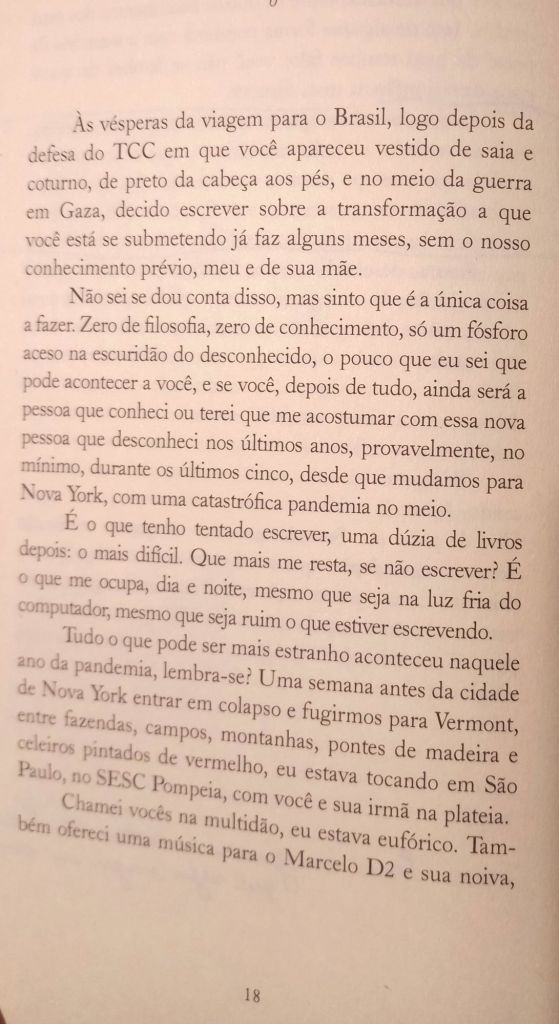 Mas Volpato vai mais longe em criar uma investigação da paternidade à luz da transição de gênero de seu filho mais velho. A investigação da paternidade é também uma investigação sobre a masculinidade – no caso, a de um homem do século 20, cheio de preconceitos, trejeitos e recalques que se transforma ao mesmo tempo em que vê a transição do filho para filha. Livro sensível e original, que transita entre o memorialismo, o ensaísmo e a reconstituição dos últimos 60 anos, ilumina um tema difícil e até então não abordado pela literatura brasileira.