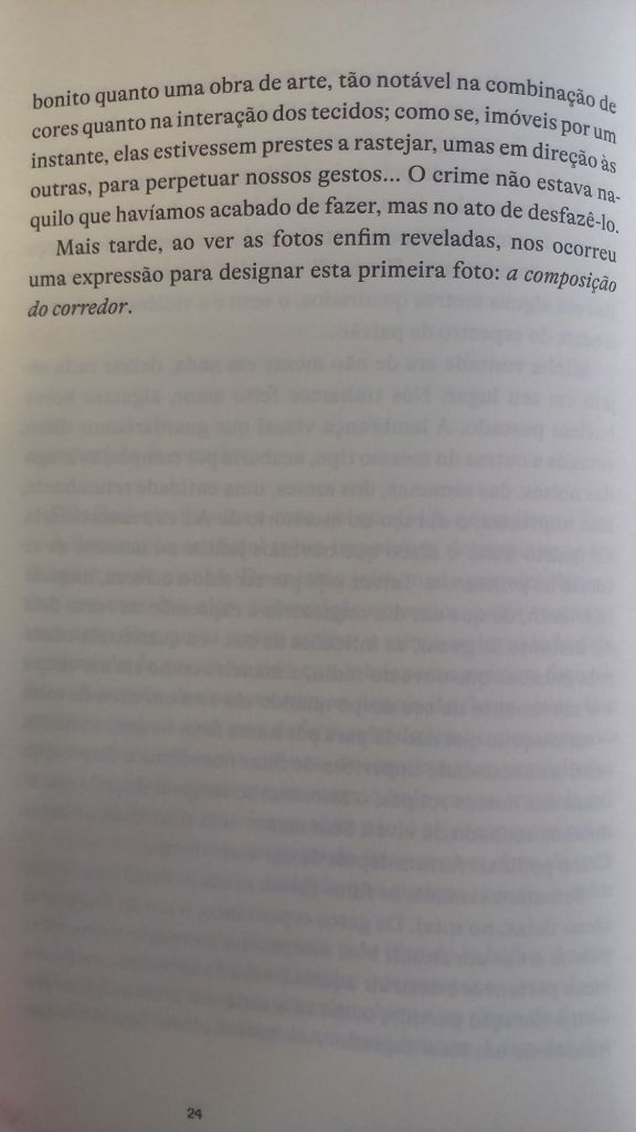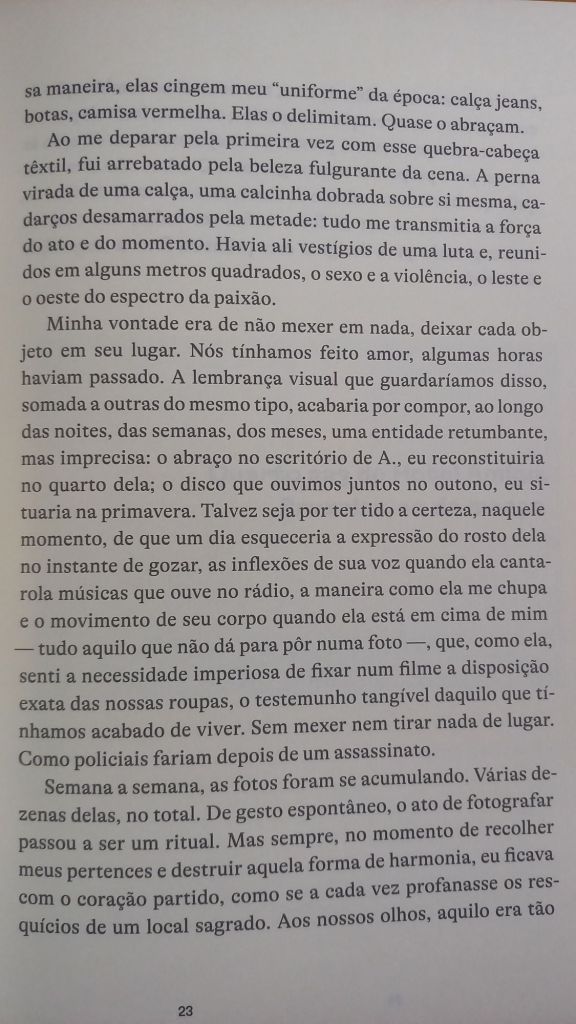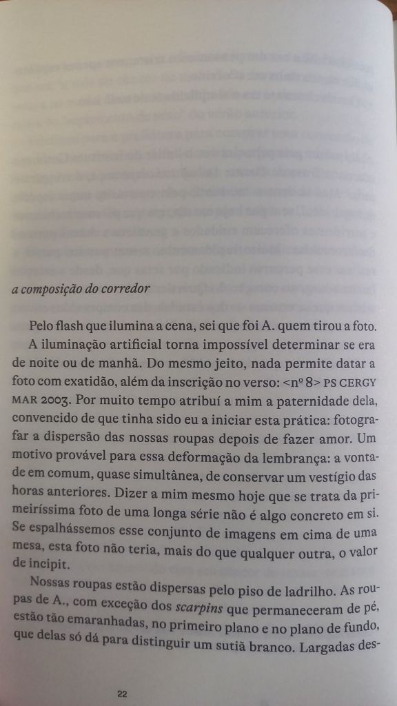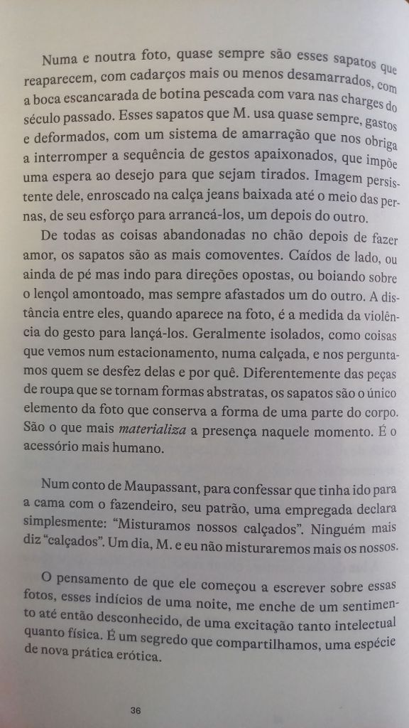 A fotografia, enquanto registro documental, também não deixar de dialogar indiretamente com a morte, uma vez que aquela “aura” da autenticidade da imagem testemunhal tem o condão de avançar no tempo. Vinte anos depois, o livro registra este encontro e também é uma espécie de legado de Marie, morto em 2022. A ideia do casal foi registrar a bagunça formada por suas roupas jogadas pelo chão pouco antes de irem transar. São portanto vestígios de um amor que estava sendo feito – imagens cheias de expectativa, mas também cheias de informação e mistério, posto que não há corpos: só as marcas de suas passagens. “O erotismo é aprovação da vida até na morte”, diz, na epígrafe do livro, Georges Bataille.