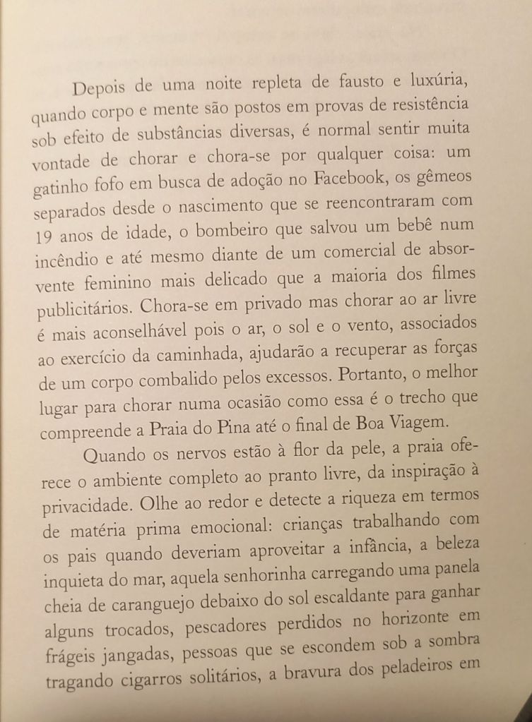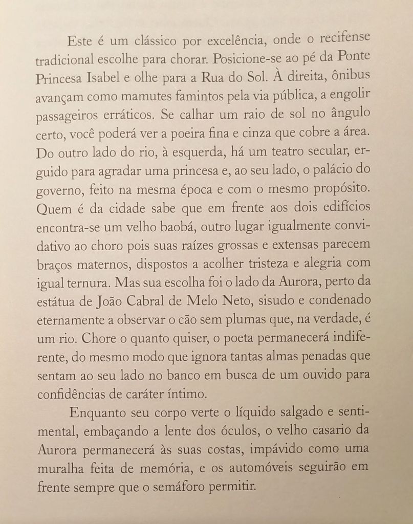 Um dos fundadores do manguebit, nos anos 1990, o sergipano Helder Aragão, aka DJ Dolores, é também artista visual, roteirista, letrista e acaba de lançar o primeiro livro, Lugares para Chorar no Recife e Outros. São crônicas, minicontos, resenhas, poemas e letras que ele primeiramente publicou em sua página no Facebook. Até que o escritor Cadão Volpato sacou que ali havia um livro e editou em sua Sejabreve. A série “Lugares para chorar no Recife” é um dos eixos da publicação – e está todo aqui embaixo. Dolores usa a estrutura de manual de instruções nonsense – que é também o leitmotiv de Histórias de Cronópios e Famas, de Julio Cortázar, com suas instruções para subir uma escada, sentir medo, dar corda no relógio, chorar etc. Em ambos, o efeito criativo é dado pelo contraste entre a tristeza do conteúdo e a greia na forma. No texto de Dolores, especificamente, há uma riquíssima e afetiva descrição de cada lugar.