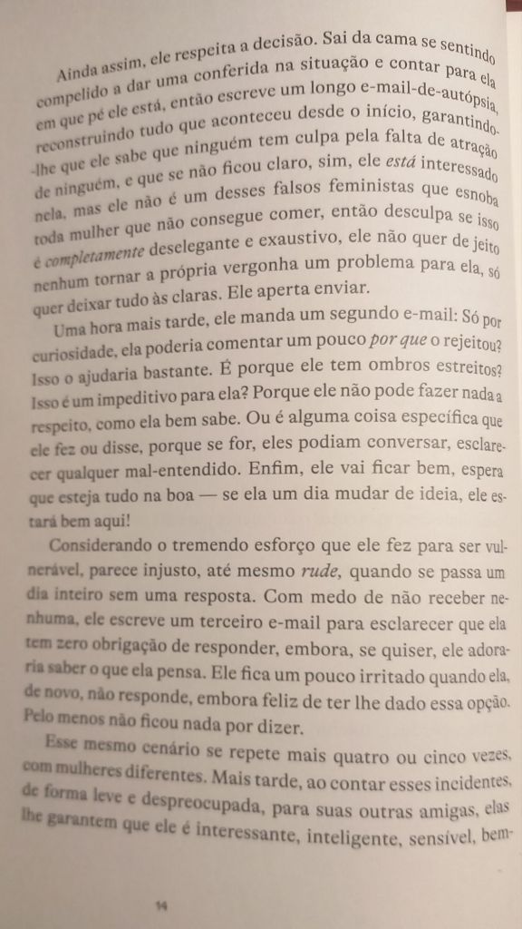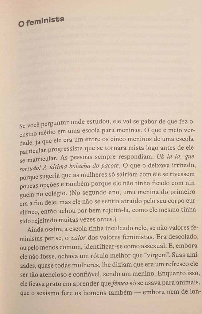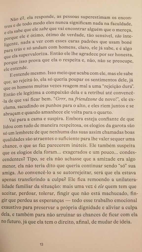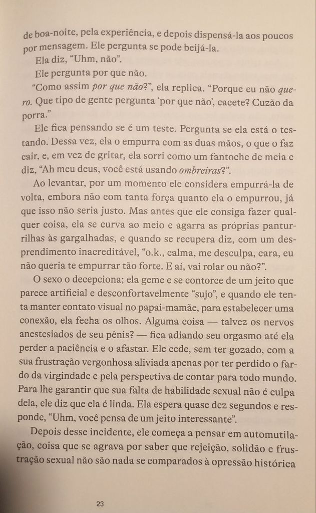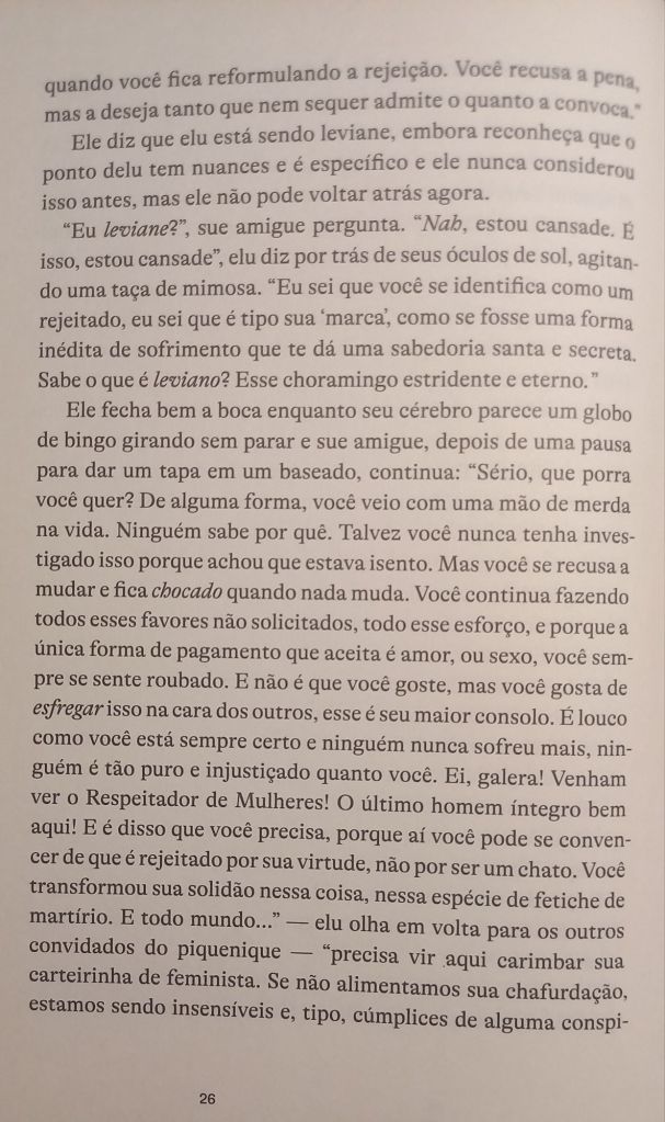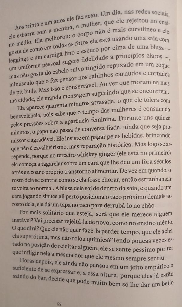 Muito por conta da espertíssima tradução de Isadora Sinay, A Rejeição, de Tony Tulathimutte (Fósforo), é uma leituras muito divertida. Sinay transpôs ao PT BR as neuras e os pitis da Gen Z e millenial com um ouvido tão afiado que parece que estamos passeando pelos reels irônicos do Juvi Chagas ou pelos chororôs de Pedro Vinício. Todos os contos deste bostoniano filho de tailandeses são protagonizados por figuras que basicamente não conseguem transar: homens brancos feministos, gamers asiáticos gays, empreendedores babacas, gordinhas solitárias e pessoas agênere. Os desqueridos passam de um conto para outro na categoria de coadjuvantes, dando ao livro um jeitão de romance – e a linguagem ao mesmo tempo empática e sarcástica, que lembra Mary Gaitskill, torna tudo embaraçosamente uniforme.